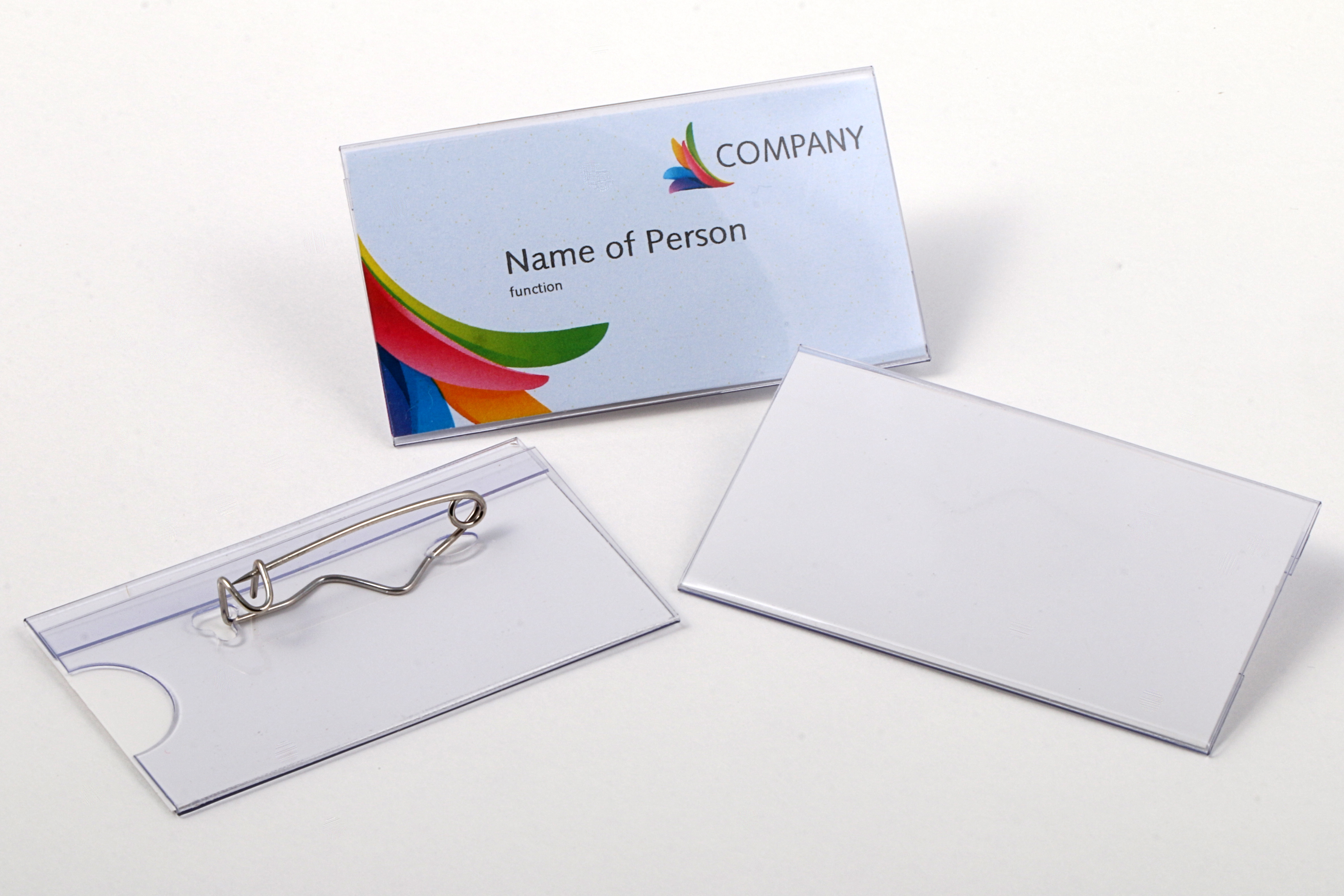 Badge en PVC transparent clair de 0,3 mm d'épaisseur. Avec une prise pour le pouce facilitant l'insertion de la carte de visite. Équipé d'une épingle dont la pointe est protégée. Dimensions de la carte de visite : largeur x hauteur 60x40mm. Boîte contenant 24 badges et cartes d'insertion séparées.