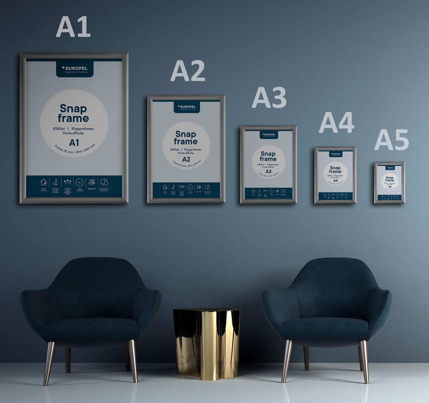 Porte-affiche clipsable Europel A2 25mm Porte-affiche de haute qualité avec système Easy-Click pour une présentation simple, rapide et représentative. En aluminium anodisé avec dos en plastique. Le film transparent antireflet (PET) protège le poster contre la poussière et l'humidité. Profil de 25mm avec coins renforcés. Livré avec matériel de fixation. Convient au format A2.