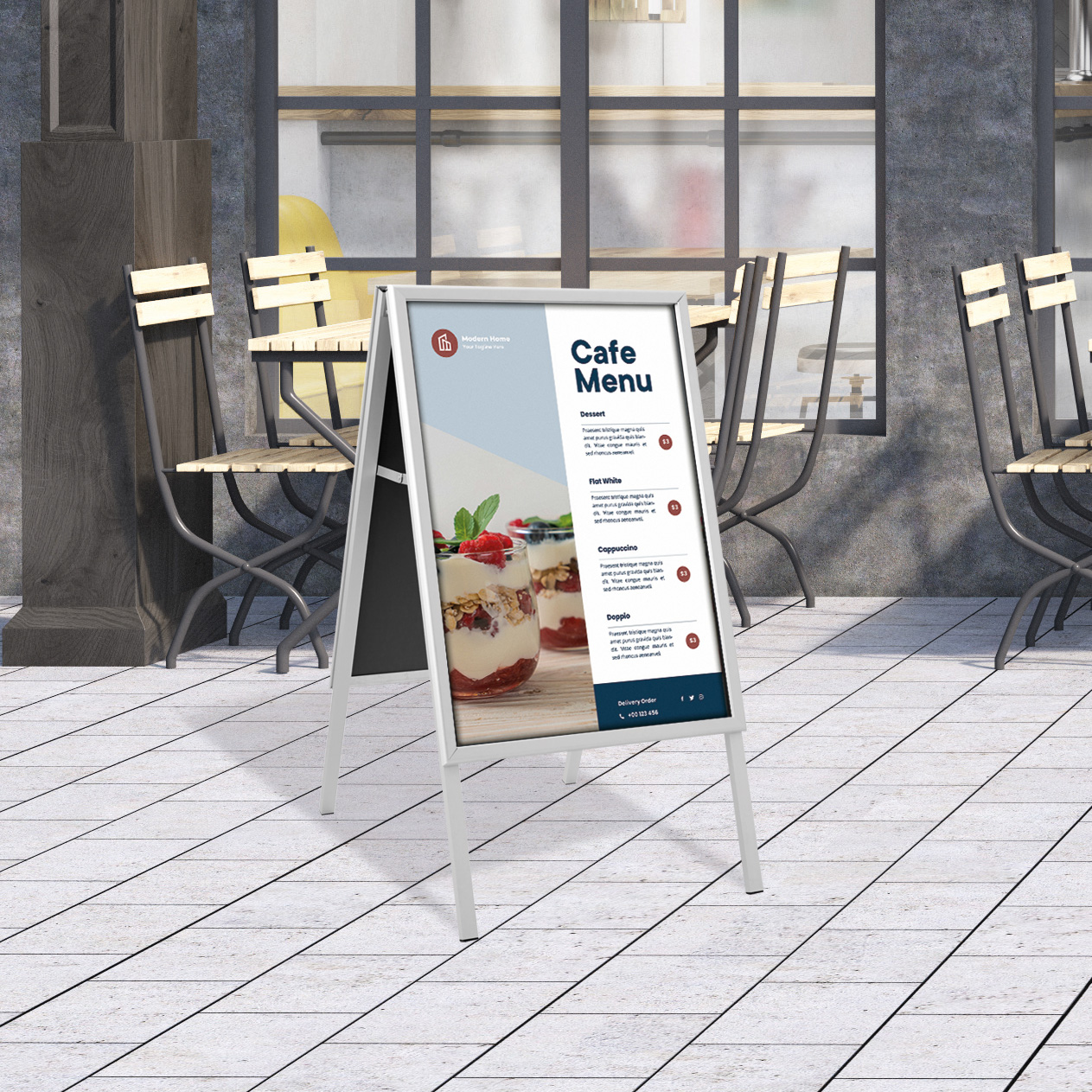 Stop-trottoir Classic A avec cadre clipsable d’un profil de 32 mm. Cadre clipsable de qualité supérieure en aluminium anodisé avec angles d’onglets, plaque arrière en polystyrène gris et feuille de protection avant transparente anti-reflets. Doté d'un système Easy-Click pour une présentation rapide et facile. Convient pour le format de papier A1. Le chevalet stop-trottoir est résistant aux éclaboussures d'eau.