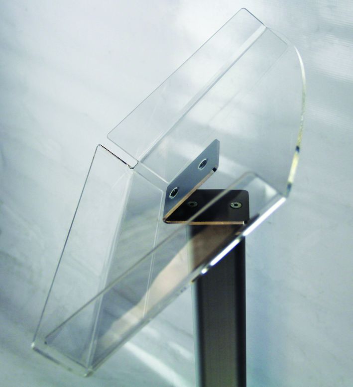 Support brochures Europel A4 sur pied *Support pour brochures, profilé en aluminium et socle en acier.*Bac à brochures en acrylate 4mm.*Format A4. *Hauteur support: 78mm.*Socle: 245x320mm.*Hauteur du bac à brochures: 340mm.*Capacité: 80mm.*Livré démonté.