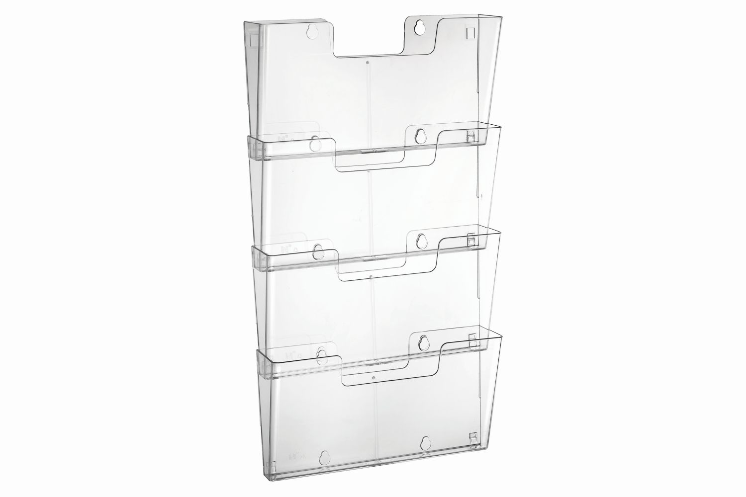 Porte Prospectus Europel ou présentoir mural 4xA4 landscape * Porte-brochure mural transparent en polystyrène recyclable. * A assembler entre eux grâce à un système innovant. * Extensible l'un à côté de l'autre ou en dessous. * Set de 4 bacs. * Convient au format A4 paysage. * Dimensions intérieures 335x70/36x180mm.