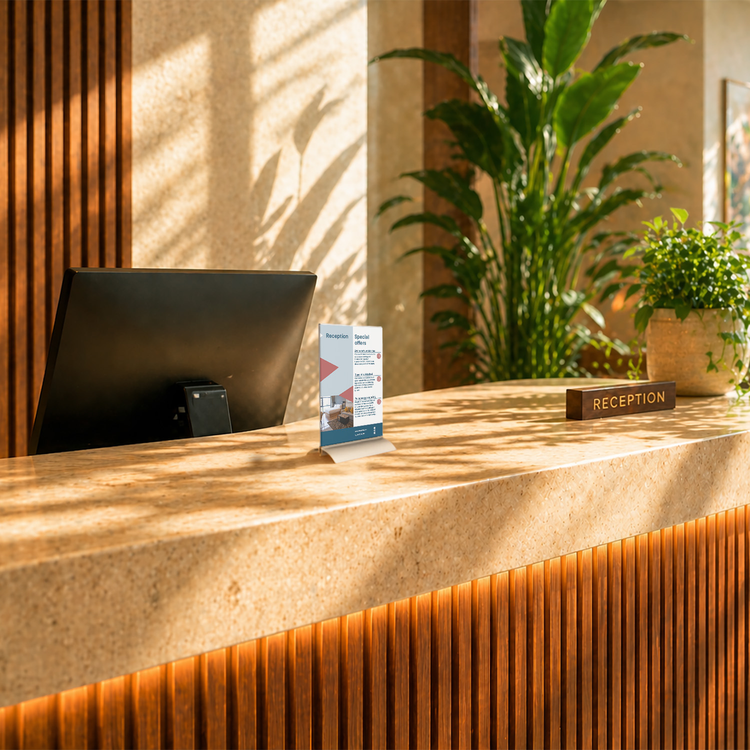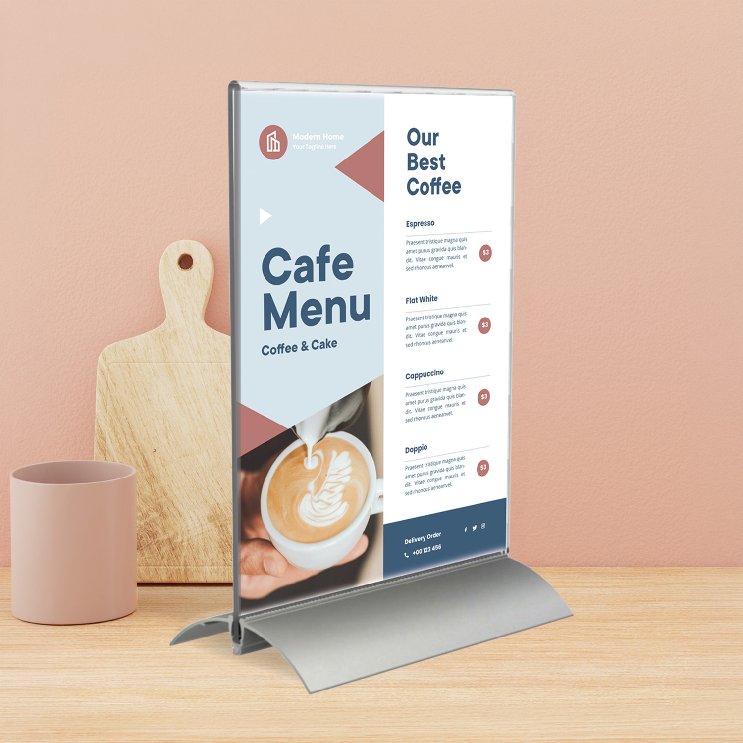 Présentoir Europel T standard de table pour Menu A5 acrylique/aluminium * Présentoir de table pour une présentation claire de menus et tarifs. * Fabriqué en acrylique de haute qualité d'une épaisseur de 2mm. * Présentation sur les deux faces. * Format A5 portrait. * Socle en aluminium haute qualité. * Support en T.