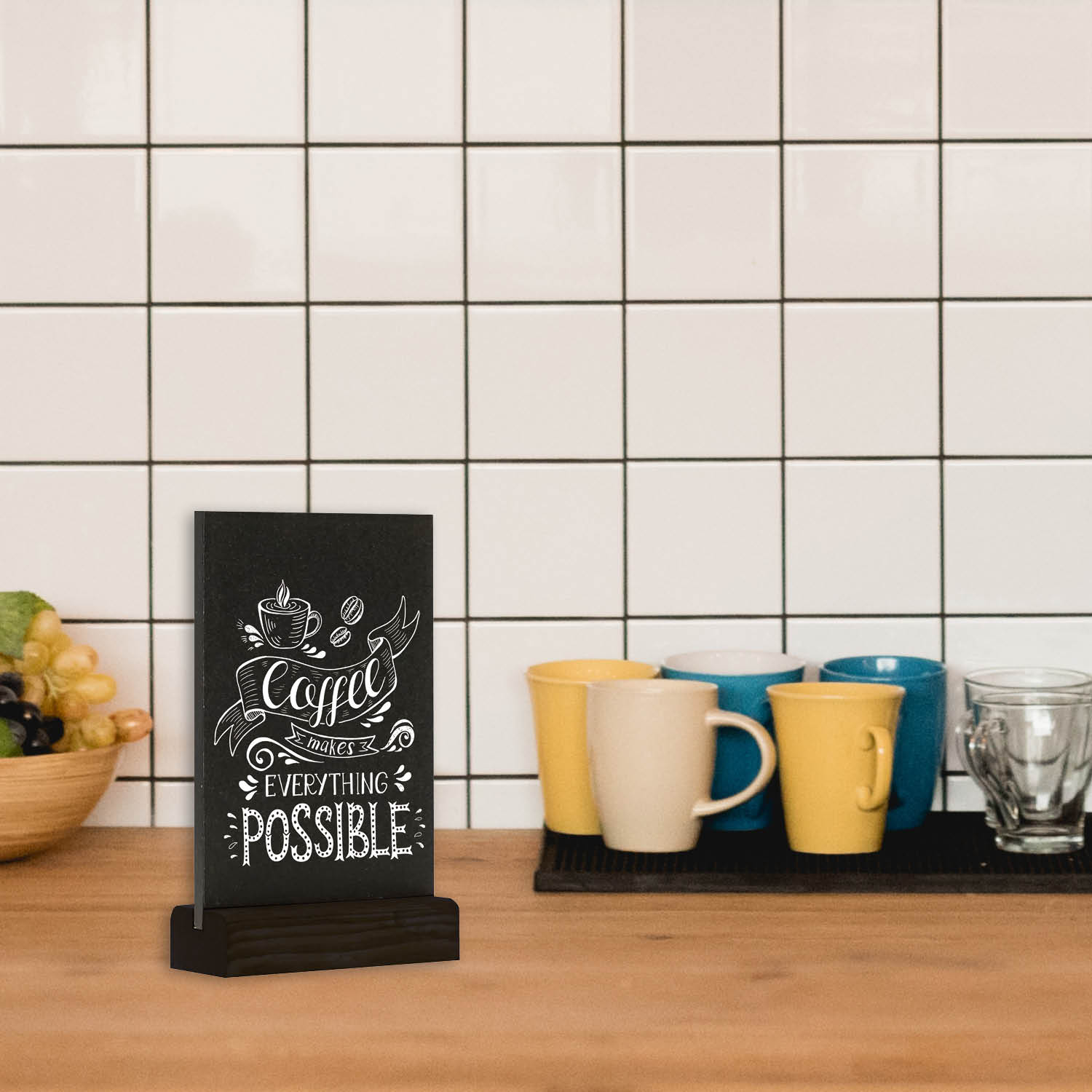 Tableau noir modèle de table, avec un pied en bois de pin, finition noir mat. Convient aux marqueurs craie à base d'eau. (Pas pour la craie à tableau). Visibilité maximale grâce à la présentation recto-verso.
