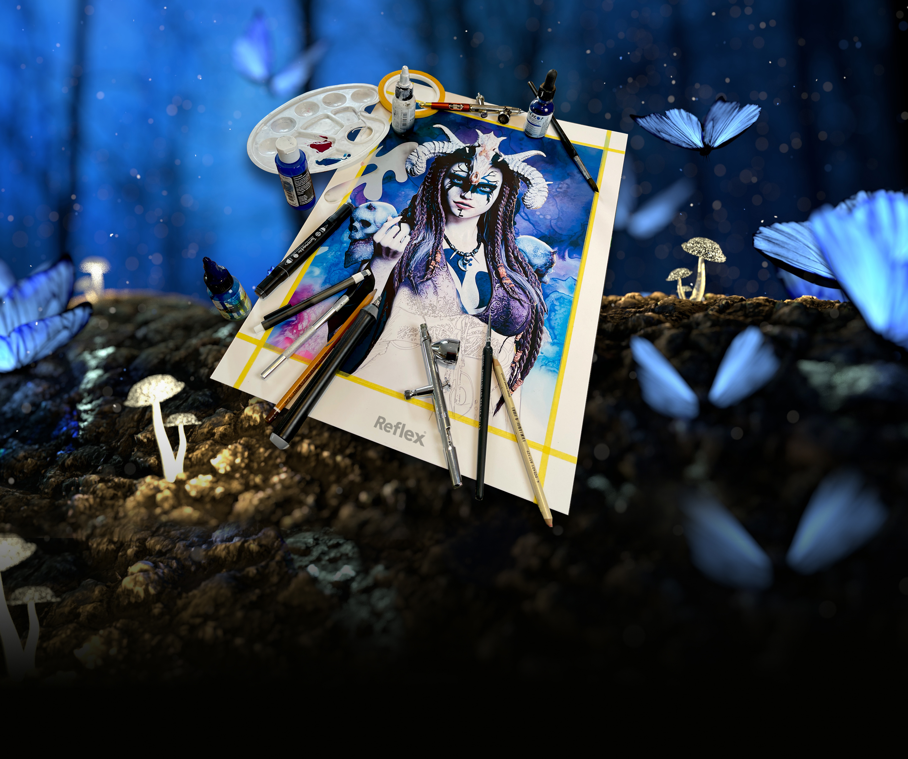 Le nouveau carton à dessin Reflex Art Board, successeur du carton "Schoellershammer 4G épais", est, avec une surface lisse entièrement nouvelle, plus pur, plus blanc et plus noble au toucher et à la vue. L'épaisseur de 1,5 mm est conservée. Ce qui est nouveau, c'est que les deux faces (recto et verso) peuvent être travaillées. Le carton lisse spécial aérographie, a été conçu pour être résistant à l'effacement et est également adapté à une large gamme de techniques humides et sèches. La nouvelle surface convient également à une variété de techniques d'effacement sans s'altérer. Ceci est vrai également avec l'utilisation de film de masquage et de ruban adhésif. La surface reste stable et ne s'effiloche pas. Même gratter la peinture avec un scalpel fonctionne beaucoup mieux sur "Reflex Artboard" que sur d'autres qualités de carton. Reflex Art Board n'est pas seulement intéressant pour les aérographes. En plus des peintures acryliques, le carton peut également être travaillé avec des aquarelles et des peintures à l'huile, de la détrempe, de l'encre et de la gouache. Un autre avantage est que Reflex Art Board reste stable, il ne gonfle pas et ne change pas de forme, même lorsque l'acrylique reste modifiable pendant des jours avec un retardateur (retardateur).
