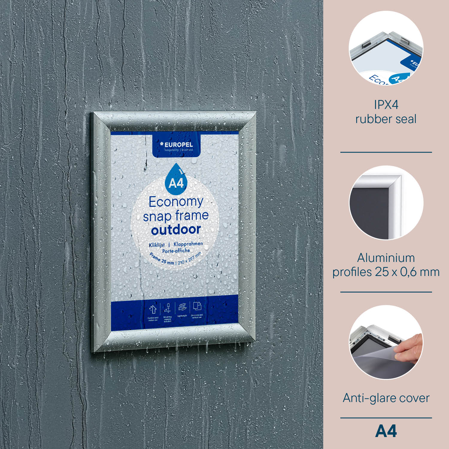 Le système de fermeture à clic permet un changement de contenu facile, sans retirer le cadre du mur. Une joints en caoutchouc et un film anti-UV et anti-reflets protègent vos affiches contre les intempéries.