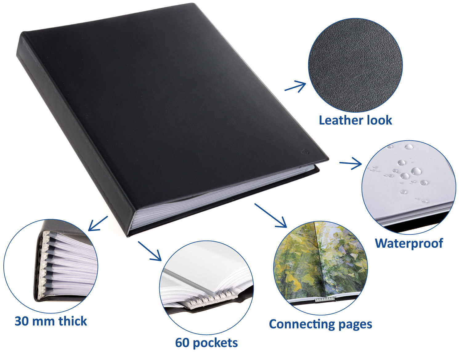 Protège-documents Rillstab A4 original en matière plastique grainée. A l'intérieur, se trouve le mécanisme Rillstab, avec 80 pochettes internes = 160 x format A4 en polypropylène sans acide. Les poches internes sont en matériau polypropylène, transparent, antireflet, épaisseur 50 mu. A droite intérieur insert vertical sur toute la hauteur. Couleur noir. Gain de place et de poids par rapport aux autres cartes de présentation et classeurs à anneaux. Les pages se tournent comme un livre.